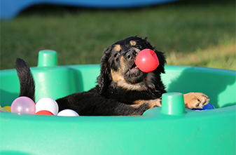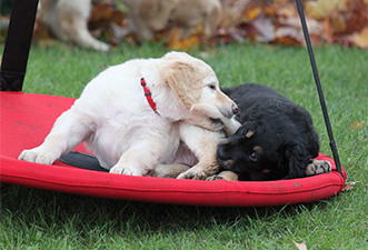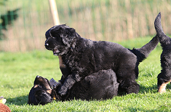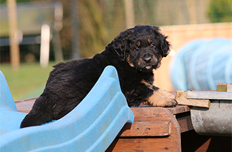 Es ist eine wahre Freude die Kleinen im großen Welpengarten zu beobachten. Sie sind unerschrocken und neugierig und alle Welpenspielgeräte werden sofort und ausdauernd in Beschlag genommen. Sei es die Hängebrücke, der 4-Fach-Tunnel, das Wackelbrett, das Hamsterrad.... alles wird ordentlich genutzt und sind sie mal müde, so schlafen sie sehr gerne auf der überdachten Terrasse oder unter der Hängebrücke und verarbeiten dort ihre Erlebnisse in wilden Träumen.